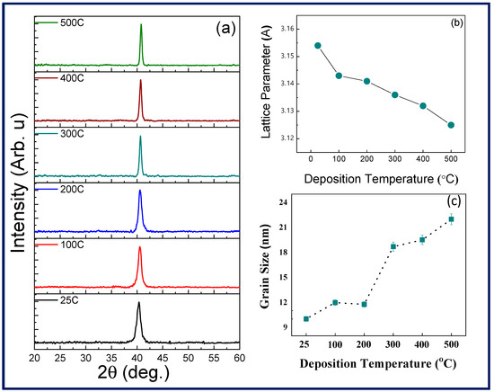 The crystal structure data and analyses of Mo films are shown in Figure 1. The XRD patterns for the Mo samples (Figure 1a) indicate that all the samples are crystalline. The XRD peak appearance at ~40.5° indicates successful deposition of nanocrystalline Mo films. Also, the evolution of the XRD peak indicates the nc-Mo preferred (110) growth. It should be noted that with increased temperature there is a shifting of the peaks as well as sharper peak formation. This general trend with an increase in sharpness of observed peaks indicates an increase in crystallinity and the average crystal size with increased deposition temperature. The lattice parameter variation is shown in Figure 1b. The lattice parameter, which is calculated from XRD data, indicates more or less a linear trend in the reduction. Also, it is noted that this trend in lattice parameter variation is largely inverse to the average crystallite size shown in Figure 1c.