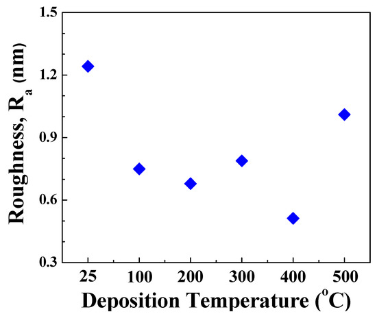 The molybdenum (Mo) thin films were deposited onto Si (100) wafers through the use of radio-frequency sputtering. We adopted the previously established procedures and methods to fabricate Mo films and the details of the deposition chamber, an Excel Model DCSS-12, were reported elsewhere [6,42]. The wafers were cleaned with ethyl alcohol and dried with nitrogen before placement in the vacuum chamber. The chamber was then evacuated to a base pressure of ∼10−7 Torr. A 2-inch diameter Mo target of 99.95% purity (Plasmaterials, Inc., Livermore, CA, USA) was used in conjunction a 2-inch diameter sputter gun placed 7 cm from the substrate. A sputtering power of 40 W was initially applied to the target while argon (40 sccm) was introduced to the chamber to ignite the plasma, with the gas flow being controlled with an MKS mass flow meter(Andover, MA, USA). Once ignition had been achieved, the power was increased to 100 W for actual depositions while final deposition pressure was tuned to 5 mTorr. Pre-sputtering was done for 15 min with a shutter closed above the gun. During deposition, the temperature of the substrate was varied from room temperature (~25 °C) to 500 °C. The deposition time for each substrate was kept constant at 30 min with constant rotation of the substrates at 3–4 rpm implemented to ensure lateral isotropy. While several iterations were made by producing at least a set of 4 samples under each and every deposition temperature, one set of samples was prepared for each deposition temperature before proceeding to characterization. Thus, we believe that the results presented and discussed in this paper present an overall picture of the effect of deposition temperature and the grain size. The average measured thickness of the deposited Mo films, as determined via ex situ spectroscopic ellipsometry, is 120 nm, and while there is an initial increase in film thickness with applied power to the sputtering gun, which is to be expected, there is a sharp decrease between the 300 and 400 °C samples with a slight increase again with the increase to 500 °C.