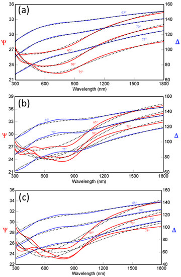 Spectroscopic ellipsometry (SE) measurements were employed to determine the electronic parameters and microstructure characteristics. The ellipsometric angles Ψ and Δ were determined over the wavelength range of 300–1800 nm using a J.A. Woolam alpha-SE Ellipsometer (Lincoln, NE, USA). All the measurements were made ex situ and at room temperature. The incident angles were selected between 65 and 75 degrees and a 10 s/angle rate was set for data acquisition. Fitting of the acquired data curves was accomplished with the CompleteEASE acquisition software [42] using a Drude–Lorentz model based on the following equation: