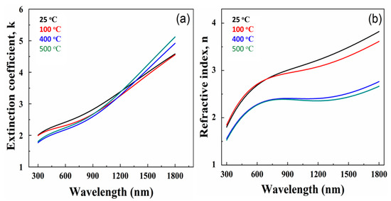 (a) Extinction Coefficient (k), and (b) Refractive index (n) as a function of wavelength. Data are shown for samples at 25 °C, 100 °C, 400 °C, and 500 °C.