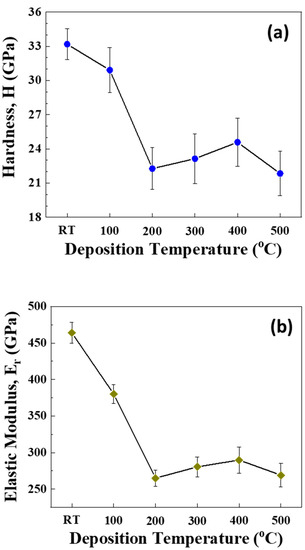 Indentation testing of the samples yielded a similar trend for both hardness (H) and elastic modulus (E), as shown in Figure 9. It can be seen that both H (Figure 9a) and E (Figure 9b) values decrease continuously with increasing deposition temperature, although the decreasing trend slows down at higher temperatures. This demonstrates an initial increase in fine-structured Mo nanomaterial, while those values tend to decrease with increasing size and formation of more crystalline Mo films. The variation in mechanical characteristics (H and E) for Mo films as a function of deposition temperature can be understood as follows. As reported widely in the literature, the mechanical strength of polycrystalline metals and alloys can be significantly improved by controlling the crystallite size [55,56,57,58,59,60,61]. Smaller size contributes to the enhanced strength. The slip is arrested along the grain boundaries which further concocts a strengthening effect [55,56,57,58,59,60,61]. For metals, the size dependence of the mechanical properties can be explained on the basis of the Hall–Petch relationship which is represented as [59]: