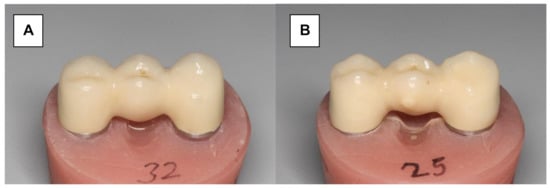 Additional 16 Y-TZP frameworks were veneered using the press-on technique (Figure 3B). The frameworks were scanned (CAD System 3Shape Scanner D700, 3Shape A/S, Copenhagen, Denmark) and superimposed with the scanned master FPD using “Dental Designer” (3Shape A/S, Copenhagen, Denmark). The veneering parts were milled in wax (Organic Wax, R+K CAD/CAM Technology) and attached to the frameworks. The basal shape of the pontic was completed manually using the silicone mold. The FPDs were embedded in a special investment material (IPS PressVEST, Ivoclar Vivadent) and the wax was expelled thermally. Frameworks were over-pressed with fluorapatite glass ceramics (IPS e.max ZirPress Ivoclar Vivadent, color: LT A3) at 770 °C (ceramic oven: Programat EP 500, Ivoclar Vivadent), and the FPDs were finalized using glaze firing (IPS e.max Ceram Glaze Powder and Programat EP 500, Ivoclar Vivadent, Ellwangen, Germany).
