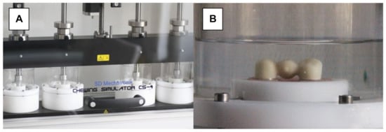 Artificial aging is usually part of in vitro studies. The simulated aging scenario of a wearing period of approximately five years was used []. The temperature changes generate stresses in the ceramic. In addition, here, a cyclic loading force of 50 N was applied to simulate clinical loading conditions. This approach is similar to that used in other studies [,,]. A value of 50 N was chosen as the minimum because this force is below realistic clinical stress levels in the posterior area [].