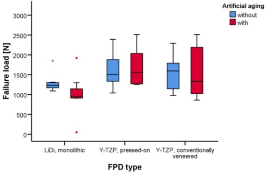 The mean failure loads of LiDi-FPDs were 1293 ± 237 and 996 ± 516 N (aging; p = 0.712), 1609 ± 427 and 1685 ± 480 N (p = 1.000) for e.max ZirPress-FPDs, and 1541 ± 438 and 1557 ± 643 N (p = 1.000) for e.max Ceram-FPDs. After aging, higher failure loads were observed for e.max ZirPress-FPDs than those for LiDi-FPDs (p = 0.042).