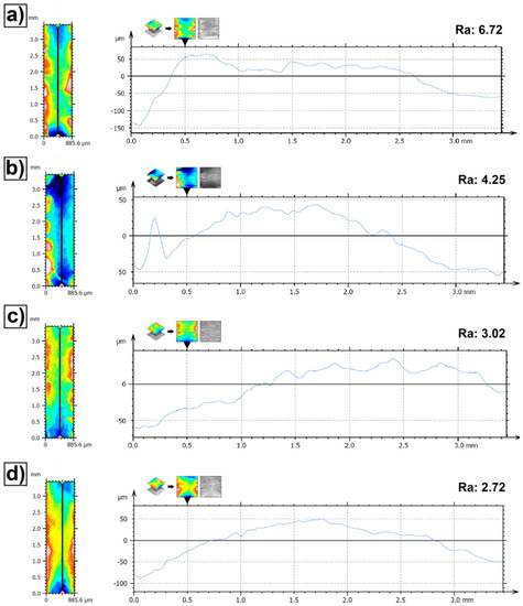 Surface roughness of Fe/ZrC coatings—single laser tracks produced using laser beam power of 500 W (a), 700 W (b), 900 W (c) and 1100 W (d).