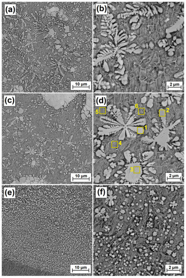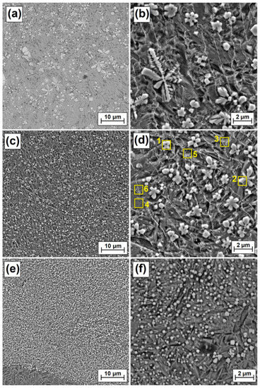 As laser beam power increased, the reduction in carbide precipitate dimensions was observed more and more clearly. The use of laser beam power of 900 W contributed to a significant reduction in the amount of dendritic carbide precipitates in the subsurface zone (Figure 8a). Separations in the form of polygons (Figure 8b) or stars are prevalent there. In the area located in the central part of the remelted zone (Figure 8c), these separations are small, not exceeding 2 µm (Figure 8d). Local occurrence of eutectics was observed between the separations. In the zone farthest from the coating surface (Figure 8e), i.e., where the substrate acts as a cooler, secondary carbide precipitates are the smallest, with their dimensions often not even reaching 0.5 µm. This area can be characterized as a fine dispersion composite system.