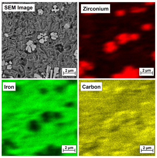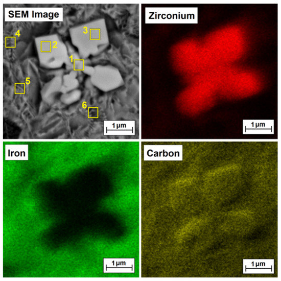 To confirm that bright precipitates in the microstructure of the coatings are secondary or primary zirconium carbides or zirconium-containing complex carbides, EDS mapping was performed, and the test results are presented in Figure 9, Figure 10, Figure 11 and Figure 12 for the Fe/ZrC coating produced at 500 W (Figure 10), 700 W (Figure 11), 900 W (Figure 12) and 1100 W (Figure 13). The sites where zirconium was identified are marked in red. As for Fe/ZrC coating produced with the use of 1100 W laser beam power, an EDS map was made in the area of a flower-shaped secondary carbide precipitation. In addition to making a standard map, which clearly shows that this separation is mainly composed of carbon and zirconium, the chemical composition was also tested in the areas marked in Figure 13.
