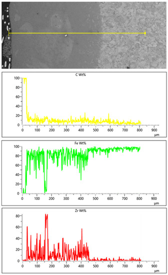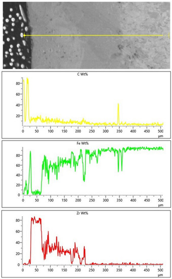 Additionally, a linear EDS analysis for Fe/ZrC coatings was performed. The limitation of this method is analyzing only the area along a given line. For composite coatings, the results of this test depend on covering the individual components of the composite (matrix and reinforcing phase) with the test line. This paper includes only exemplary test results for the extreme values of the laser beam power: 500 W (Figure 14) and 1100 W (Figure 15). Due to increased carbon content in the areas of occurrence, zirconium carbides in the form of agglomerates was found. The presence of zircon throughout the entire thickness of the remelted zone was determined. This is confirmed by both the EDS mapping and the microstructure tests. It is planned to conduct a detailed analysis of EDS, EBSD and XRD on coatings made with the same parameters but in the form of multiple tracks.