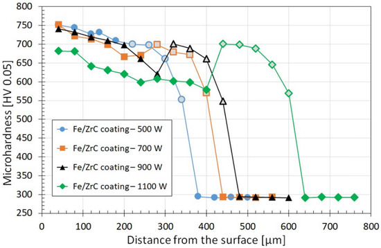 Microhardness of Fe/ZrC coating produced on steel using different laser beam power-markers with a gray background on the graph indicating that the measurements are in the heat-affected zone.
