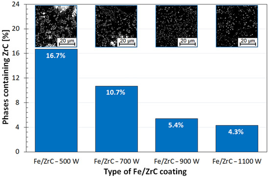 Table 2 presents the results of chemical composition measurements using the EDS method for individual measurement areas marked in Figure 6d (Fe/ZrC coating produced using 500 W), Figure 7d (Fe/ZrC coating produced using 700 W), Figure 8d (Fe/ZrC coating produced using 900 W) and Figure 9d (Fe/ZrC coating produced using 1100 W). Characteristic and repeatable areas were selected for the tests, both for the iron-based matrix and for carbide precipitates. The obtained data confirmed that the dendritic carbide phases were released in the coating. The dendritic arms were therefore complex carbide phases composed of components derived from the substrate as well as from zirconium carbide, which is the coating modifier. It can also be seen from Table 2 that the matrix consists mainly of iron, but certain small amounts of zirconium or zirconium carbides are observed in it. The exact phase composition should be confirmed using the XRD method, but due to the production of only single laser tracks in the preliminary studies, this was not possible. Studies in this area will be continued on multiple tracks and will be presented in the author’s future papers.