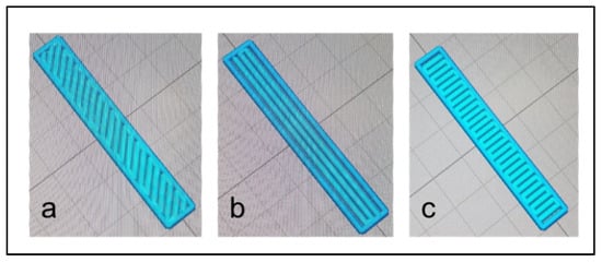 The different 3D printing patterns according to the three different raster angles: (a) +45°/−45°, (b) 0°, and (c) 90°.