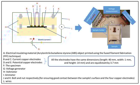 where R is the electrical resistance (Ω), S is the cross-sectional area (m2), which is equal to the width of the sample multiplied by its thickness, and L corresponds to the distance between the internal electrodes (3.7 mm).
