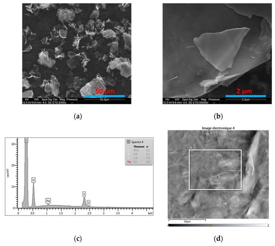 Figure 3 corresponds to the scanning electron microscopy investigations carried out on the M5 GNP. In particular, information about the morphology of M5 GNP is given by Figure 3a,b, which clearly show the platelet form of graphene. Figure 3c represents the energy-dispersive X-ray spectroscopy (EDX) analysis of the M5 GNP surface to figure out the elements composing the zone indicated by the square shown in Figure 3d. These elements are mainly carbon (89.6%) and oxygen (8.8%). Other elements were also identified, such as sulfur (1.6%) and sodium (0.1%). The M5 oxygen content can be attributed to the presence of carbonyl and ether/alcohol groups [36].
