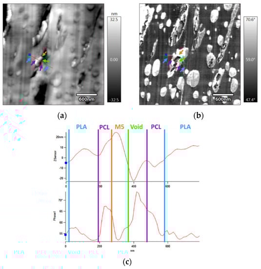 (a) AFM topography; (b) AFM phase images of the PLA/PCL/10 wt.% M5 injection-moulded sample; (c) topography and phase profiles on a drawn red line that is traced in (a,b) (the fleshes in the images point towards the different components of the composite and their colours match the designation of the peaks in the profiles).