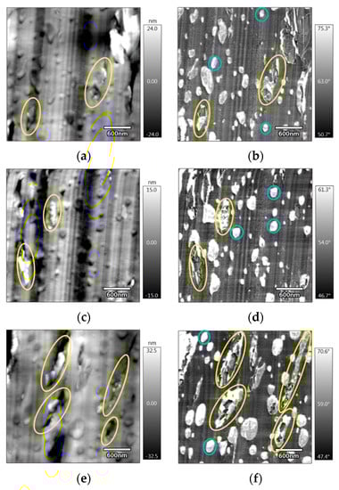 Figure 5 also corresponds to an injection-moulded PLA/PCL/10 wt.% M5 composite. In both their topography (Figure 5a,c,e) and their corresponding phase images (Figure 5b,d,f), the yellow circles surround some graphene particles that seem to be localized in the PCL nodules. This selective localization of the graphene in the PCL phase rather than the PLA phase was performed in a work carried out by De Aguiar et al. [37]. In their work, they stated that the simultaneous melt blending of two polymers, such as PLA and PCL, whose weight percentages were 80 wt.% and 20 wt.% respectively, characterized by melting temperatures of 155 °C and 60 °C, respectively, drives the nanoparticles to the PCL phase. The PLA’s viscosity is greater than that of the PCL for all the analyzed shear rates and this difference determines the preference of the nanoparticles for the lower-viscosity polymer phase. Furthermore, due to the slight differences in terms of the interfacial tensions between PLA/GNP (0.82 mJ.m−2) and PCL/GNP (0.3 mJ.m−2), the viscosity effects dominate. In the present study, and based on the contact angle measurements and the wettability calculations, the M5 GNP was expected to be localized in the PLA phase. However, Figure 5 shows that this is not the case, and that M5 GNP prefers PCL. This can be explained by the dominance of the kinetic factors, such as the viscosity, over the thermodynamic factors. Moreover, it was highlighted by Kelnar et al. [38] that the addition of GNP to the PLA80/PCL20 blend showed the significant presence of GNP in the PCL phase and a limited presence at the interface. The authors explained that this phenomenon was due the initial dispersion of the nanoparticles in the first melting polymer phase, PCL, during the one-step melt mixing process. Furthermore, due to the similarity between the interfacial energies of PLA, PCL, and GNP, there is no sufficient driving force that can cause the transfer of graphene to PLA. It is also important to note the circular form of the PCL nodules, indicated by blue circles in Figure 5b,d,f. When the M5 particles are situated in these nodules, their size becomes bigger and their form becomes more elongated (yellow circles in Figure 5b,d,f). This can be attributed to the aggregation of the nanoparticles and their alignment inside the PCL nodules and can also be the result of the alteration of the polymer viscosity ratio by the nanoparticles present in one of the polymer phases [37].