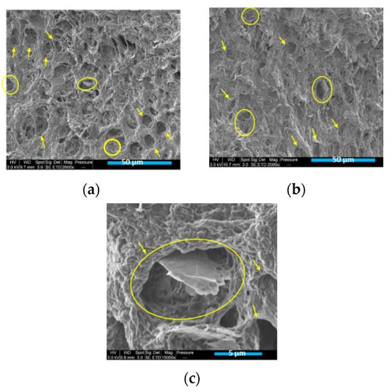 (a,c) SEM images of toluene-etched, injection-moulded PLA/PCL/10 wt.% M5 composite; (b) SEM images of toluene-etched, 3D-printed PLA/PCL/10 wt.% M5 composite (The yellow circles surround the GNPs positioned in the pores where the PCL nodules were expected to be located and the yellow fleshes are pointed towards these pores).