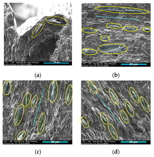 In Figure 8, several SEM images of the injection-moulded (b, c, d) and 3D-printed PLA/PCL/15 wt.% M5 (a) composites are shown. The yellow ellipses in Figure 8a surround some graphene platelets whose orientation is driven by the printing pattern. The extrusion-induced orientation phenomenon of GNPs is due to the large shear rate between the molten composite and the inner wall of the nozzle [39]. In Figure 8b–d, the doted blue lines show that most of the graphene nanoplatelets (surrounded by yellow circles) featured similar orientations in these parts of the injected samples, as determined by the flow direction of the molten material during the injection process. Wu and Drzal compounded GNP and polyetherimide (PEId) by melt-extrusion followed by injection molding. They figured out that the GNP have unidirectional orientation in the injection-moulded specimens [40].