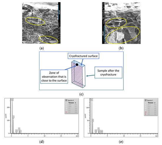 Figure 9a,b correspond to the SEM pictures of the injection-moulded and 3D-printed PLA/PCL/15 wt.% M5 specimens, respectively. These images are relevant to the parts close to the surface (small black circle in Figure 9c). What is clear is the lower presence of graphene close to the surface of the injection-moulded sample compared to the 3D-printed sample (graphene particles are surrounded by yellow circles); this is supported by the EDX spectra (Figure 9d,e). The EDX of the 3D-printed sample shows greater carbon content (66.2%) than the EDX of the injection-moulded sample (60.2%); this confirms the higher presence of GNP on the surface of the 3D-printed sample.