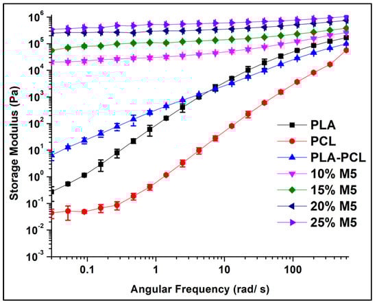 The visco-elasticity measurements of the PLA/PCL/M5 nanocomposites were performed to study the influence of GNP loading on the performance of the composites as well as to study the morphology and the formation of the internal graphene network within the manufactured composite systems. The state of dispersion and interactions between polymer/nanoparticles are closely related to their rheological properties [41]; therefore, the distribution of the nanoparticles in the polymer matrix was examined using this measurement technique.