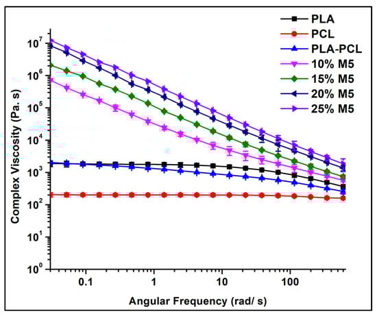 The complex viscosity curves of pure PLA and PCL polymers in addition to their blend and composites.