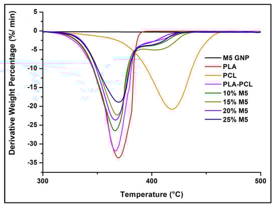 The thermal stability of the GNP, PLA, PCL, and PLA/PCL blends and their composites are shown in Figure 13 and Table 3. These results show that PCL features better thermal stability than PLA, as indicated by the higher onset and maximal degradation temperatures. The mixture of the PLA and PCL produced a blend with thermal properties closer to those of PLA than to those of PCL due to the greater weight percentage of PLA in the polymer blend. In the blend and composites, there were two steps of degradation, corresponding to the individual degradation of both non-miscible polymers. Furthermore, the comparison between the theoretical and experimental percentages of char yield at 600 °C for all the compositions shows that both were close. This indicates that there was no improvement in char formation and that there was a kind of dilution effect, which could be attributed to the formation of graphene aggregates in the polymer matrix. Regarding the thermal stability of the composites, normally, the GNP in these materials is prone to forming a thermally stable network around the polymer matrix, which could act as a protective layer. This layer is expected to lower the rate of heat transfer and the mass loss of the polymers. In addition, the GNPs’ interfacial interaction with the polymer matrix could increase the energy required for the polymers’ decomposition, leading to greater thermal stability of the composites compared to the polymers alone [44]. Furthermore, the radical scavenging function of GNP could inhibit the degradation process of the organic polymers [45]. For instance, with respect to the PLA/graphene and PCL/graphene systems, normally, the presence of graphene enhances the thermal stability of these polymers; this effect was observed in several studies [11,46,47,48,49,50,51,52,53]. However, in our case, the addition of M5 GNP to the PLA/PCL blend did not cause any improvement in thermal stability, regardless of the percentage of GNP. This may be attributed to the presence of aggregates of GNP and their poor interfacial adhesion to the polymer matrix.