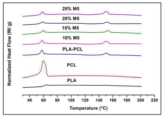 Poly(lactic acid) or polylactide (PLA) is an aliphatic thermoplastic polyester that is biobased, biodegradable, biocompatible, and compostable. It is characterized by important mechanical properties, such as Young’s modulus in the 3–4 GPa range and tensile strength in the 60–70 MPa range [3]. However, PLA features some disadvantages, such as lack of ductility (elongation at break <10%); blending it with other rubbery polymers such as polycaprolactone (PCL) can improve its toughness. PCL is a semi-crystalline aliphatic polyester that is biodegradable and biocompatible but oil-derived. Furthermore, due to the different mechanical and thermal properties of both polymers, their mixture can be a material with well-balanced properties [4].