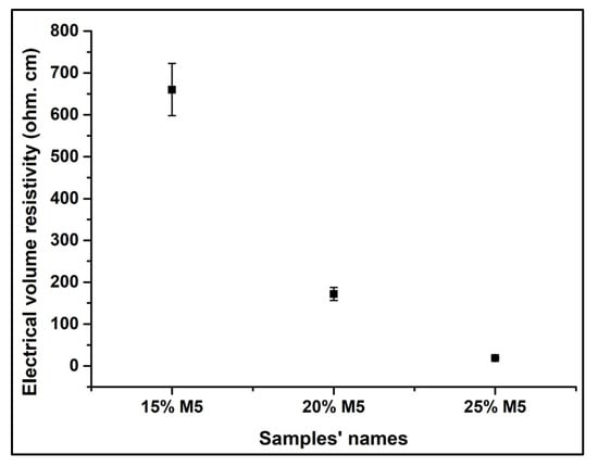 The variation of the electrical volume resistivity of the composites as a function of the percentage of M5 GNP.