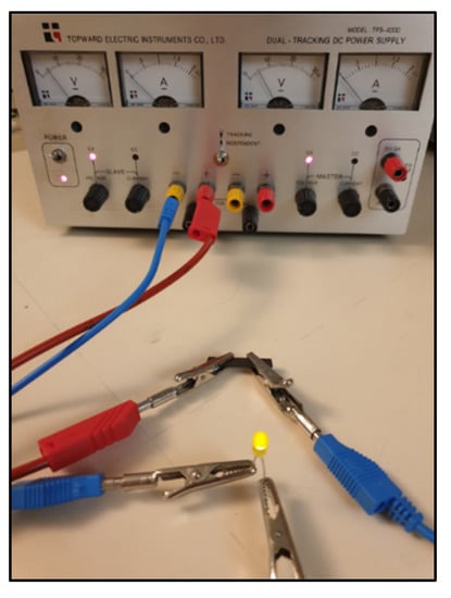 To test the applicability of these semi-conductive 3D-printed composites, an electrical circuit was constructed using a voltage generator (voltage of 5 V), a LED, and the 3D-printed sample. When the 3D-printed PLA/PCL/15 wt.% M5 was connected in the circuit, there was no lightening of the LED. However, when the PLA/PCL/20 wt.% M5 and PLA/PCL/25 wt.% M5 were connected instead, the LED lit up. By keeping the same voltage (5 V), the 25 wt.% sample led to more light intensity of the LED due to its lower electrical volume resistivity. The circuit connected using the PLA/PCL/25 wt.% M5 3D-printed composite is shown in Figure 16.