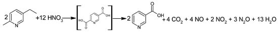 The Swiss Lonza group has been producing NA since 1956 [42]. One of the first technologies used by Lonza was the catalytic, liquid-phase oxidation of 5-ethyl-2-methylpyridine with HNO3 (Figure 3). The oxidation process was carried out at 190–270 °C at 2–8 MPa [1,43] to produce an unstable intermediate, 2,5-pyridinedicarboxylic acid (isocinchomeronic acid). The intermediate was decarboxylated at 220 °C to form NA, the crude product of which was isolated by crystallization. The total reaction time was approximately 45 min, and the first processes ran with 80% conversion and 70% efficiency [43].