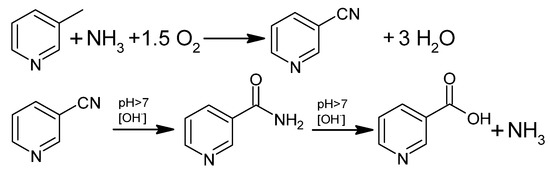 The literature describes the oxidation of 3-methylpyridine in the liquid phase (Figure 5) with the use of environmentally friendly oxidizing agents, such as oxygen, H2O2, organic hydroperoxides, and peroxy acids, as well as non-ecological ones, such as HNO3.