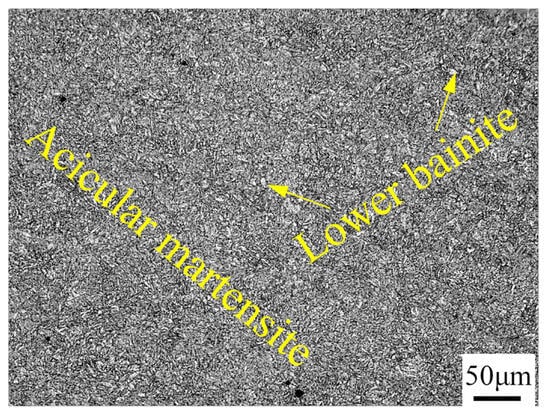 The base mental (BM) used in this test is a 30CrNiMoNb homogeneous armor plate that has been quenched and tempered at low temperature. According to GJB 8486-2015, its brand number is defined as 6211. The microstructure of 6211, as shown in Figure 1, is mainly composed of acicular martensite and a small amount of granular bainite. The size of the base material is 310 mm × 15 mm × 5 mm, and the butt end faces have a 30° Y-shaped groove (or single V groove with broad root face) with a 1-mm root face. The welding wire material is HCr20Ni10Mn7Mo high-hardness austenitic stainless steel wire with a diameter of 1.2 mm. The main chemical composition of base material and welding wire is shown in Table 1.