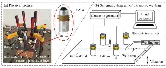 The test system consists of a welding system and an ultrasound-assisted system. The welding system is a PANA-AUTO KRⅡ500 welding machine (MIG/MAG) produced by Panasonic (Osaka, Japan). The ultrasound-assisted system consists of a signal generator, an ultrasonic generator, and an ultrasonic transducer. The signal generator is a RIGOL DG4102 function/arbitrary waveform signal generator, which can output 1 μHz–60 MHz arbitrary waveform signals. For the ultrasonic generator, its maximum output power is 3000 W, and its output frequency range is (0–30) kHz. The ultrasonic transducer is a PZT4 piezoelectric ceramic transducer with a diameter of 70 mm and a resonant frequency of 14.85 kHz. The physical configuration before welding preparation is shown in Figure 2a, and the overall sketch of test system is shown in Figure 2b.