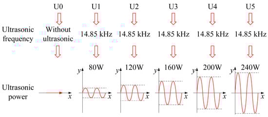 Because the base metal is thin, single-pass welding is adopted in this study. Before welding, oxidation film and oil stains are removed from the surface of the base metal through mechanical grinding and acetone wiping. To prevent the welding damage to the worktable surface and ensure good weld formability, a flat and smooth copper backing is placed under the base metal with a butt clearance of 1 mm. The ultrasonic transducers with a buttered bottom are distributed on the front side of the base material, as shown in Figure 2b. An insulating fixture is used to fix each transducer until the transducer bottom is in close contact with the base metal surface. Then, the ultrasound-assisted system is turned on for welding according to the welding parameters shown in Table 2. To study the effect of different ultrasonic power on the macroscopic morphology, microstructure, and mechanical properties of RHA welded joints in the welding process, six groups of experiments have been designed. The first group is a control experiment without ultrasonic application. In experiment groups 2–6, the ultrasonic waves with different power strengths are applied in the welding process. The specific group numbers and ultrasonic settings are shown in Figure 3.