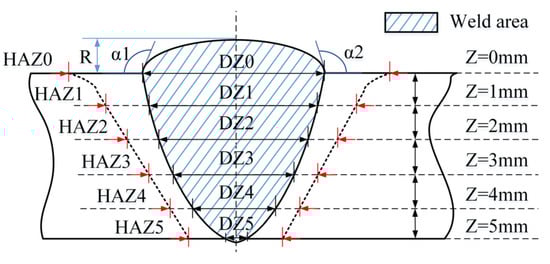 As can be seen from the cross sections of the welded joints in Figure 6, the HAZs on both sides of the conventional weld are obviously asymmetric, but the HAZs on both sides of the ultrasonically regulated weld are very symmetric. This is mainly because the arc energy is evenly distributed to both sides of the weld by the acoustic flow effect caused by the transducers arranged symmetrically on both sides of the weld [36]. Except for the bowl-shaped U5 welds, the cross sections of all welds are in a regular funnel shape. As can be seen from the data in Figure 6, the widths of both WZ and HAZ will increase first and then decrease with the increase of ultrasonic power. U3 is the turning point of this trend. When Z = 0 mm and Z = 5 mm, the WZ width of the U3 weld will increase by 32% and 75%, and the HAZ width will increase by 43% and 60%, respectively, compared with the U0 weld. However, when Z = 0 mm, the WZ width of the U5 weld will decrease by 24%, and the HAZ width by 8%, compared with the U0 weld. When Z = 5 mm, the WZ width of the U5 weld will increase by 29% compared to the U0 weld. Therefore, it can be inferred that ultrasonic regulation can increase the weld width, especially when Z = 5 mm. This also indicates that the ultrasonic energy propagates unevenly in the weld pool. This phenomenon is related to the thickness of the base metal and the surface tension of the metal melt, as well as the ultrasonic-induced change in the driving force of the melt flow in the weld pool [23].