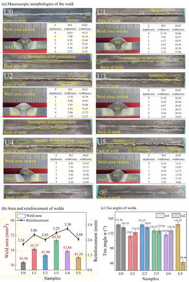 With the change of weld width, other morphologic parameters of a weld will also change. The analysis of data in Figure 6b,c shows that ultrasonic regulation can increase the weld area and reinforcement height. It has also been mentioned in previous studies that ultrasonic wave can increase the energy of weld pool diffusion [37]. However, with the increase of ultrasonic power, the weld area may not increase. In this study, the area of the U3 weld is the maximum. It is also found that the toe angles () of ultrasonically regulated welds are smaller than those of conventional welds. In particular, the toe angle of the U5 weld is almost an acute angle. This is because the surface tension of the melt is changed by cavitation effect and acoustic streaming effect during ultrasonic regulation, thus steepening the toe angle. As a result, the residual stress of the weld toe will undoubtedly increase to a certain extent, which is also very regrettable.