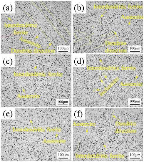 The microstructure of a weld zone of austenitic stainless steel is mainly composed of austenitic dendrite matrix and interdendritic ferrite. Interdendritic ferrite can clearly show the outline of austenite dendrite. The state of weld microstructure can be evaluated by judging the size and distribution of ferrite. Figure 7a–f, respectively, show the microstructures of the U0–U5 welds. Some grains of the U0 weld are relatively small and are evenly distributed, as shown in the lower left of Figure 7a. However, some grains are coarse, with very strong global directivity and incomplete fragmented original dendrites. The grain state of the U1 weld is similar to that of the U0 weld, as well as has some areas with strong grain directivity, which, however, are obviously improved compared with the U0 weld. The areas with strong grain directivity are obviously smaller, alternately distributed, and approximately vertical, as shown in Figure 7b. In the U2 weld, the grain distribution is much better and more uniform, but some grains are coarse. The microstructure of the U3 weld is shown in Figure 7d. It can be seen that the U3 weld is in the best condition and that its grains are fine and uniformly distributed. In the U4 weld, the interdendritic ferrite begins to aggregate, the grains grow up, and the grain distribution in some areas is poor. In the U5 weld, some interdendritic ferrite is clustered together, and the grains are coarse and unevenly distributed.