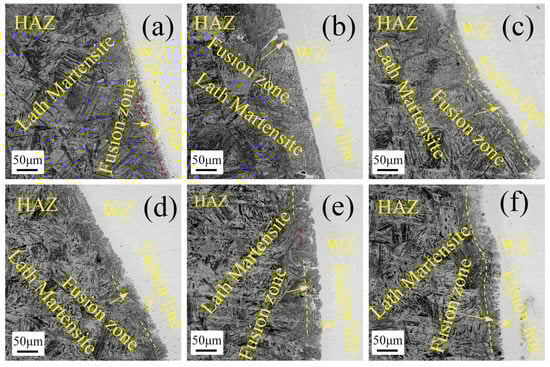 The relevant studies have shown that the acoustic streaming effect generated by ultrasonic wave will affect the welding temperature and heat transfer and, finally, affect the HAZ near the weld [39]. Figure 8a–f correspond to the microstructures near the U0–U5 welds, respectively. In such a microstructure, there is a fusion zone where the coexistence of solid and liquid can be seen during the input of high welding heat. The microstructure is mainly composed of martensite-like layer and weld melt infiltration. A coarse-grained zone composed of coarse lath martensite is just adjacent to the fusion zone. As shown in Figure 8, with the increase of ultrasonic power, the width of the fusion zone becomes wider and the fusion line becomes bigger. This is because the ultrasonic wave will affect the welding energy. With the increase of ultrasonic power, the fluidity and diffusion capacity of weld melt are enhanced, and the infiltration of weld melt into the fusion zone becomes more serious [40]. At the same time, the ultrasonic streaming effect will improve the cooling rate of the weld. The ultrasonic vibration process itself will also generate a lot of heat, which can ensure a temperature environment in the process of weld cooling and result in the martensite refinement.