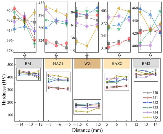 Through the above microstructure observation, it is found that ultrasonic power has a great influence on the microstructure of the weld and HAZ. This will inevitably affect the mechanical properties of a welded joint. The microhardness of BM, HAZ, and WZ zones was tested in six welded joint samples, namely U0 to U5. The test results are shown in Figure 9. The microhardness distribution in each sample is basically the same, i.e., the BM hardness is the highest, followed by HAZ hardness and WZ hardness. Specifically, the hardness values of different zones are quite different, which is directly related to the ultrasonic power. However, the influence of ultrasonic wave on the base metal is small. This study mainly discusses the microhardness of the weld and HAZ.