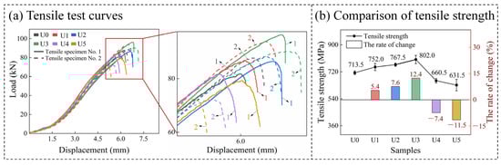 In the tensile test of the samples, the strength of BM and HAZ is much higher than that of WZ, so the fracture position of all the tensile samples is WZ. Figure 10a shows the real tensile curves of 12 tensile samples in 6 groups. All curves have an inflection point at 1.5 mm displacement, and then rise sharply after the inflection point. When the ultrasonic power is U1 to U3, the slope of a curve will increase. With the increase of ultrasonic power, the tensile strength of the samples will also increase. The tensile strength of the two U1 specimens is basically the same, but the tensile strength of the No. 1 sample at U2 and U3 is stronger than that of the No. 2 sample. However, when the ultrasonic power is U4 and U5, not only the slope of the curves but also the tensile capacity of the samples will be reduced. The tensile capacity of the samples will decrease with the increase of ultrasonic power. The two tensile samples at U4 and U5 show the same trend as those at U1–U3, i.e., the tensile capacity of the No. 1 sample is stronger than that of the No. 2 sample. Figure 10b shows the change of average tensile strength of all samples relative to U0 tensile strength. The tensile strength of the U3 weld is the highest, up 12.4% from U0. The tensile strength of the U4 and U5 welds is greatly reduced. In particular, the tensile strength of the U5 weld is 11.5% lower than that of U0. This is because the acoustic steaming and cavitation effects generated by ultrasonic wave have regulated the grain state and macroscopic morphology of the welded joints [42].