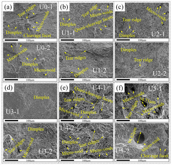 SEM picture of the fracture of a tensile sample: (a–f) U0–U5, respectively; 1 and 2 correspond to tensile specimen No. 1 and tensile specimen No. 2, respectively.