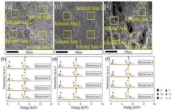EDS energy spectrum analysis: (a,c,e) the fractures and EDS zones of the No. 1 sample at U0, U3, and U5, respectively; (b,d,f) the EDS energy spectra of the U0, U3, and U5 welds, respectively.