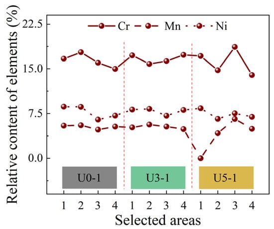 The 6211 armor steel and stainless-steel welding wire have different microstructures and chemical compositions. During welding, the weld metal will be diluted. In addition, before the solidification of weld pool, the metal solution will flow with the driving force in the pool to cause the metal element segregation. The elements of stainless steel welding wire, such as Cr, Mn, and Ni, play a key role in deciding the mechanical properties of the weld. Therefore, the four zones on the fracture surface of the No. 1 tensile sample at U0, U3, and U5 are selected for element content analysis. The analysis results are shown in Figure 12 and Figure 13. The element segregation in the U0 weld is moderate, the element distribution in the U3 weld is uniform, and the element segregation in the U5 weld is serious. It can be seen that ultrasonic wave can regulate the element segregation but not very effectively. Moreover, when the ultrasonic power is very high, serious element segregation will be caused. This is because the ultrasonic waves have changed the melt surface tension and increased the melt flowability. When the ultrasonic power is higher, the melt in the weld pool will flow better and can be more easily and evenly distributed. However, a stream of very powerful ultrasonic waves can also quickly gather metal elements to cause serious segregation.