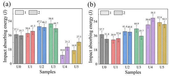 Homogeneous armor steel is mainly used for weapons, and its impact resistance is very important for the overall product performance. Generally speaking, the WZ and HAZ of a 6211 welding structure have lower strength and can be damaged easily by an impact. In view of this situation, four impact samples were selected at the welded joint, as shown in Figure 4, including the WZ impact samples 1 and 2, and the HAZ impact samples 1 and 2. The test results are shown in Figure 14. The average impact absorption energy of WZ and HAZ in the U0 state is 36.4 J and 34.75 J, respectively. After the ultrasonic regulation at appropriate power, the WZ impact absorption energy of welded joints will increase gradually with the increase of ultrasonic power. The average WZ impact absorption energy in the U3 state is 47.75 J, which is significantly higher than that in the U0 state. However, high-power ultrasonic wave will cause a sharp decrease in the impact resistance of WZ, which is similar to the law of microhardness change. The impact resistance of HAZ increases with the ultrasonic power, but the maximum impact absorption energy appears in the U4 state. Therefore, ultrasonic power is not the only factor affecting the impact resistance of HAZ during the experiment.
