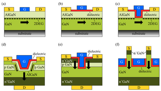 Schematic of representative GaN-based transistors: (a) Schottky-gate HEMT; (b) MIS-HEMT; (c) hybrid MIS-FET with fully recessed AlGaN barrier; (d) trench CAVET; (e) trench MIS-FET; (f) vertical FinFET.