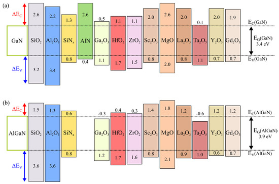 Conduction band offset (∆EC) and valence band offset (∆EV) of various dielectric materials with respect to (a) GaN, calculated by Robertson and Falabretti [56], and to (b) Al0.3Ga0.7N, calculated by Reddy et al. [57]. Note that, in (a,b), the different energy bandgaps of the insulators were assumed in the calculations. The conduction band (EC) and valence band (EV) of GaN and AlGaN are marked as dashed lines. The energy bandgap (EG) of GaN and AlGaN is also indicated.