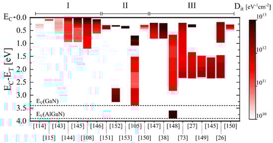 Interface density distributions (column) extracted from literature for (I) Al2O3/GaN, (II) Al2O3/GaN/AlxGa1xN/GaN and (III) Al2O3/AlxGa1−xN/GaN structures. The corresponding reference is indicated at the bottom of the graph for each column. The conduction band minimum EC of GaN and AlGaN is set at 0 eV as reference. The valence band maximum EV of GaN and AlGaN, accordingly to the bandgap values of 3.4 eV and 3.9 eV, respectively, are also illustrated as dashed lines.