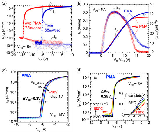 Transfer characteristics of Al2O3-gated AlGaN/GaN MIS-HEMTs fabricated on free-standing HVPE GaN substrates and subjected to PMA at 300 °C in N2 atmosphere, reported by Ando et al. [147]. In (a,b), the transfer characteristics of MIS-HEMTs with and without PMA are compared in a semi-log scale and as a function of the gate overdrive voltage, respectively. Transfer curves in (c,d) were obtained after applying an initial gate voltage stress up to 10 V and by increasing the temperature up to 150 °C, respectively.