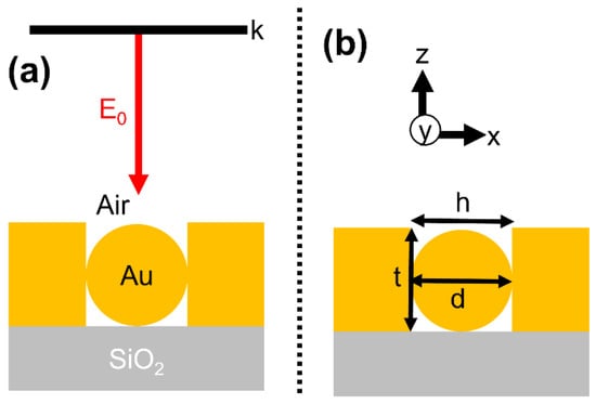 Optical modeling is carried out using the three-dimensional (3D) finite-difference time-domain (FDTD) method (Lumerical FDTD solutions, ANSYS Inc. Vancouver, Canada). The modeled structure consists of a metallic hole with a nanoparticle (NP) on a SiO2 substrate (Figure 1a). To begin with, we simplified the model consisting of a single hole with a single NP. For both the hole and NP, we used gold as a material. The geometrical parameters are as follows: hole’s width and thickness are given by “h” and “t,” respectively; NP diameter is given by “d” (Figure 1b). For most of this study, we used the following conditions: d = 100 nm; h = 100 nm; and t = 100 nm. In the case of geometrical tolerance analysis, the condition is set to h ≠ t. The 3D structure is surrounded by perfectly matched layer (PML) boundary conditions in XYZ directions. A broadband plane-wave source is used to excite the structure in a normal direction from the top (+Z) with an incident field of “E0” and wave vector “k”. Meshing conditions: “5 nm mesh covering the total simulation area and a 0.3 nm mesh-override size surrounding nanostructure of our main concern”. The following refractive indices are used: Johnson and Christy database for gold and Palik database for SiO2 [31,32]. Air surrounds the nanostructure on top with a refractive index of n = 1.
