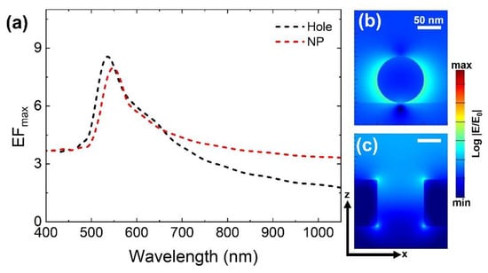 (a) Near-field enhancement EFmax spectral properties taken from individual NP and metallic hole on SiO2 substrate. Extracted cross-sectional XZ electric field profiles from their resonance wavelength position of NP structure (b) and metallic hole structure (c) at 550 nm and 535 nm, respectively. Scale bars in Figure 2b,c correspond to 50 nm.