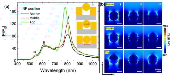 Here, we introduce an integrated plasmonic nanostructure (NP in a metallic hole) on a SiO2 substrate as an alternative geometrical design to enhance plasmonic properties. In the first part of the optical analysis, we evaluated how the position of the NP in the hole determines the plasmonic properties. Following geometrical conditions used in this section: h = t = d. We applied these geometrical conditions for the following requirements: position of NP on the top of the hole (suitable with a state of h = d); simplification of a model (h = t = d); and flexible understanding of plasmonic properties from our structure. The inset Figure 3a displays the three modeled NP positions: bottom, middle, and top. In practical realization, a NP positioned on the top will be easier to fabricate but, at the same time, there can be a minor probability of the NP’s movement towards the bottom. By considering the possibilities of NP locations, we compared top, middle, and bottom conditions. Figure 3a displays the near field enhancement EFmax spectra from these nanostructures. We marked three dominant resonance peak positions from “i” to “iii” to interpret the origin of plasmonic modes. Superior EFmax properties are revealed when NP is positioned at the top of the metallic hole. The bottom position displays comparatively lower EFmax values from its resonance wavelength marked as “i”. The near field EFmax properties deteriorated from 173, 125, and 87 when the NP position moved from top to the bottom. The wavelength position marked at “i” is chosen to distinguish primary plasmonic properties due to its dominant gap mode characteristics, which are revealed from the cross-sectional XZ electric field profiles (Figure 3b). Highly concentrated, enhanced near-field spots can be seen at metal–metal contact positions (with the better case being the NP positioned at top) in the case of “i,” explaining its dominant gap mode origin when compared to “ii” and “iii”. In comparison to “i”, weakly enhanced near-field spots can be seen at metal–metal contact positions at “ii”, thereby assigning it to “supporting gap mode”. NP mode is observed at “iii” as there is no trace of enhanced local field at metal–metal contact [27,29].